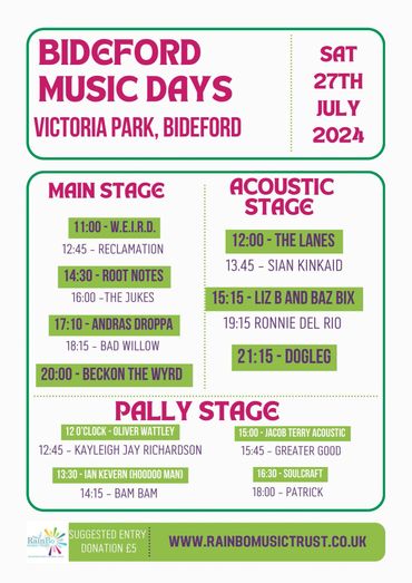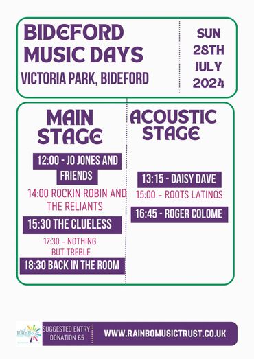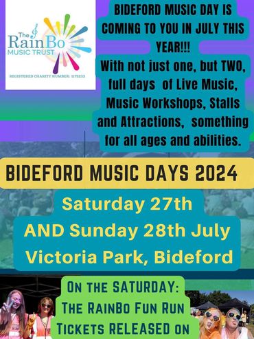 Bideford Music Day is an event held in Bideford Town Centre (in Victoria Park). The event is an opportunity for individuals and groups to experience live music. The event also gives budding musicians the opportunity to perform on a stage with a full PA to a live audience - for many participants this is the first time they have performed in front of an audience on this scale.